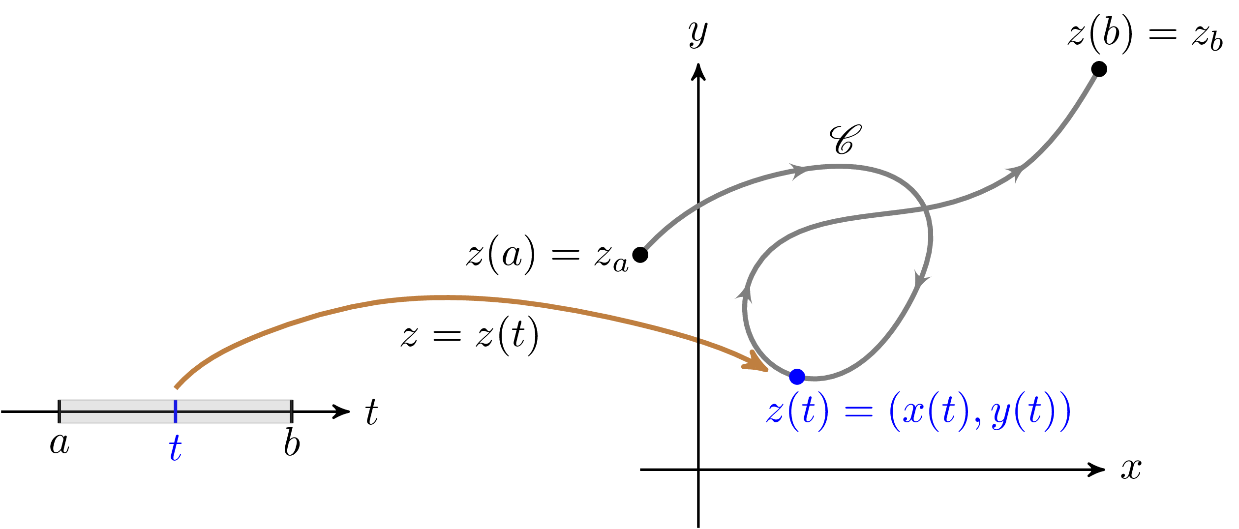 C: z:[a,b]→Ct↦z(t)=x(t)+iy(t),此處 z(t) 稱為曲線 C 之參數化。一般而言對應的 x(t) 與 y(t) 都是 t 的連續函數時,因此 z(t) 也會是連續函數。