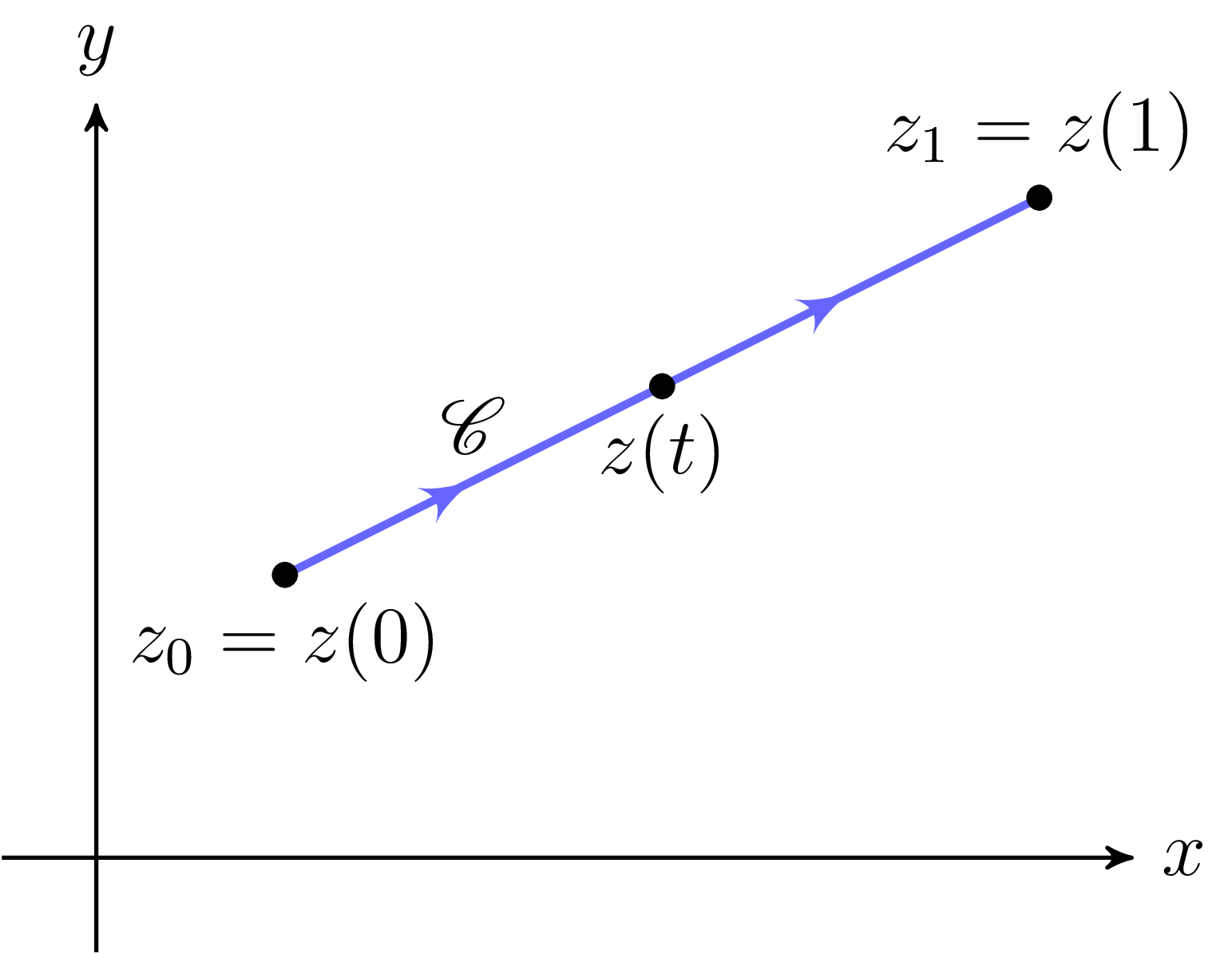 −C:γ(t)=z(1−t)=z0+(1−t)(z1−z0), t∈[0,1],=z1+t(z0−z1), 即 γ(0)=z(1)=z1 以及 γ(1)=z(0)=z0(即起點、終點互換)。
