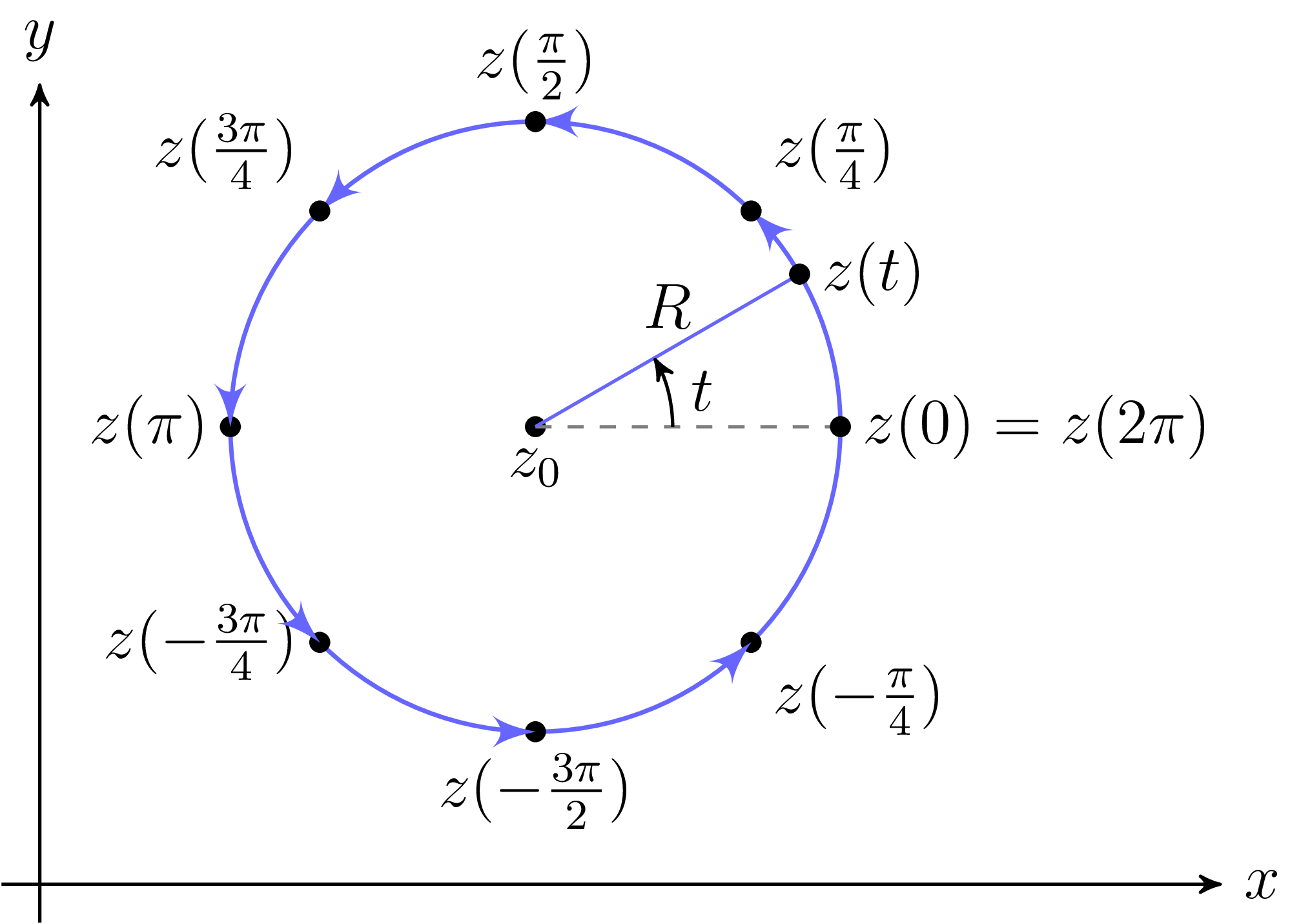 下圖表示一個圓,其參數式為 z(t)=z0+Reit,t∈[0,2π],明顯地 z(0)=z(2π),且函數 z(t) 在 [0,2π] 上為1-1映射,因此此圓是一條簡單閉合曲線,亦即是一條Jordan曲線。