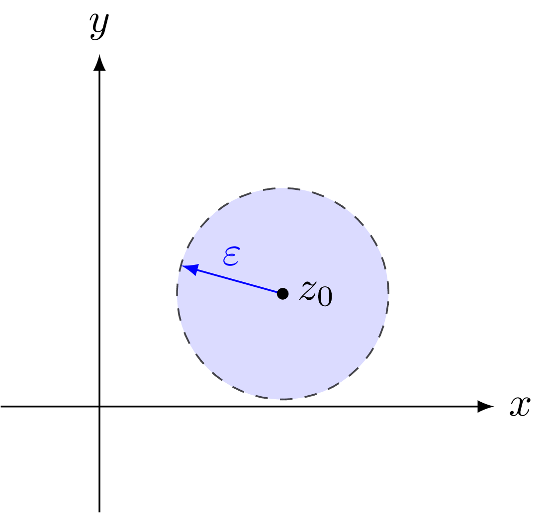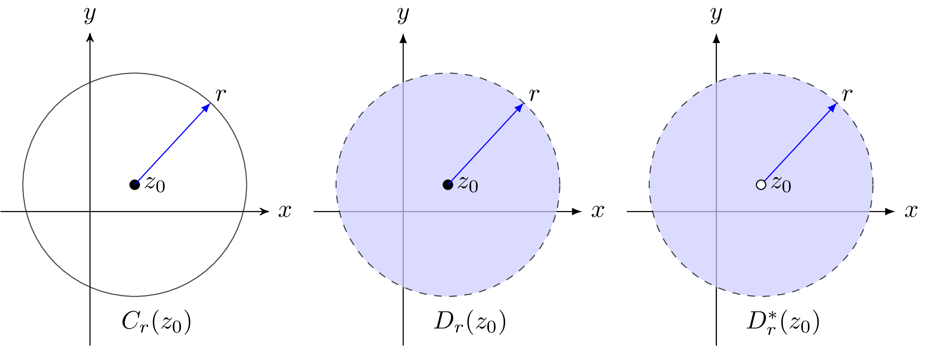 接著定義兩個常用名詞,集合 Cr(z0)={z∈C∣∣z−z0∣=r} 表以 z0 為圓心、半徑等於 r 的圓;而集合 Dr(z0)={z∈C∣∣z−z0∣<r} 表以 z0 為圓盤心、半徑等於 r 的圓盤;又 Dr(z0) 的閉包 (closure) 記為 Dr(z0)=Dr(z0)∪Cr(z0)={z∈C∣∣z−z0∣≤r}, 包含圓盤的邊界在內的集合,以及Dr∗(z0)=Dr(z0)∖{z0}={z∈C∣0<∣z−z0∣<r} 稱為去心圓盤 (punctured disk)。
