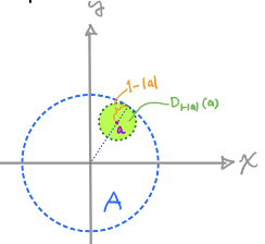 已知 intA⊂A 。欲證 intA=A,設任意點 a∈A,則有 ∣a∣<1 且 ∃ ε=1−∣a∣>0 使得若 z∈Dε(a) 則有
