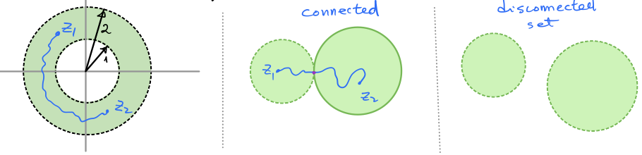 - 集合 S 的連通集合 (connected set) 的充要條件為存在連接集合S內任意兩點的曲線完全落在S內,即 ∀z1,z2∈ S,∃z1z2⌢D⊂S。