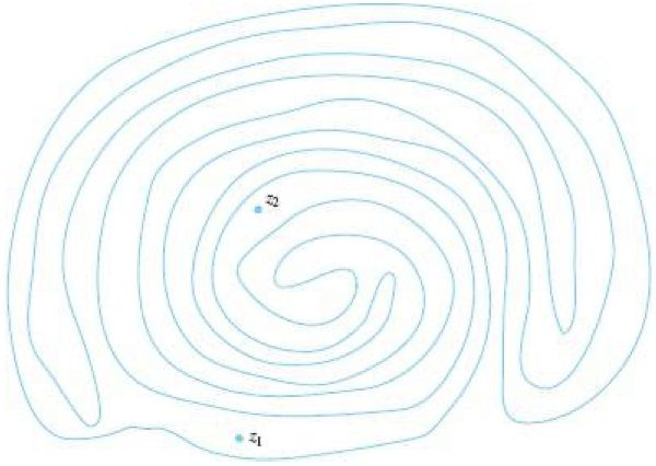 圖1.5-13: z1,z2 是在曲線的內部還是外部?(取自 Mathew and Howell, Complex Analysis, 6th ed., Jones & Bartlett Learning, 2012, Figure 1.32)
