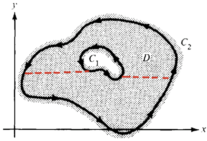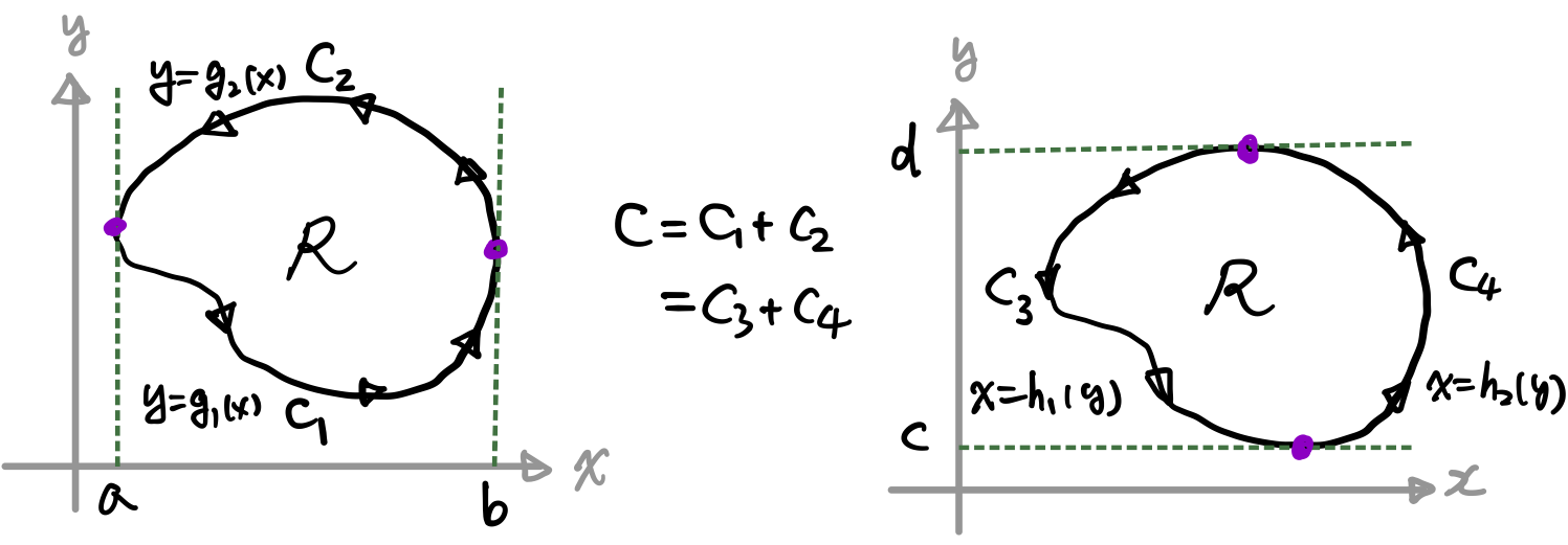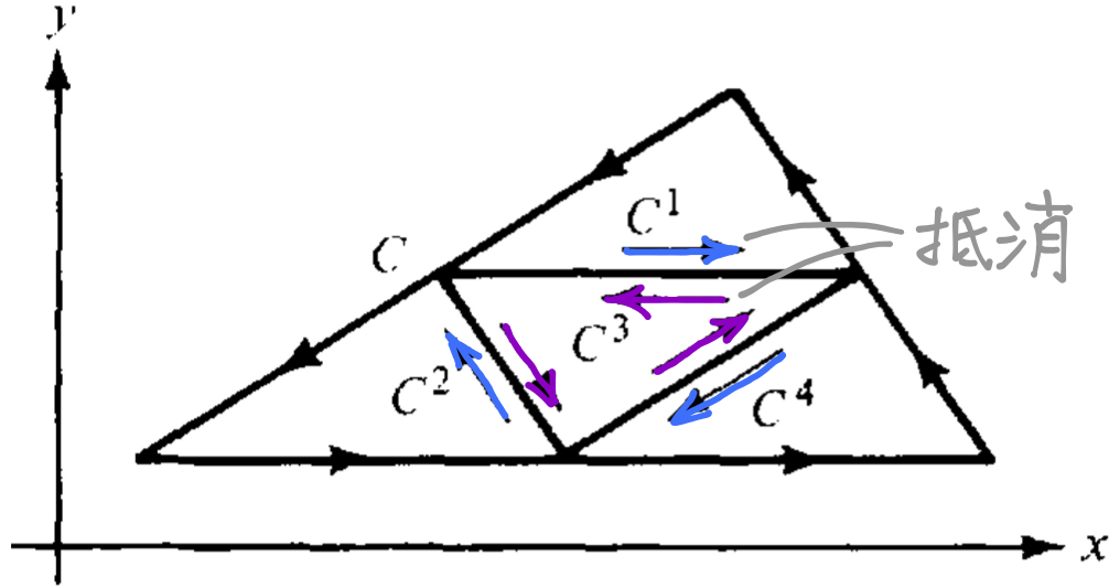 設 C 為三角形正向圍線如下圖所示,令 R=Int(C) 且將 R 分成四個等面積的區域,由 C1, C2, C3, C4四個過三角形 C 三邊之中點所形成的正向圍線。由於部分線段積分方向相反,積分值會互相抵消,因此 C=C1+C2+C3+C4,且 Ck, k=1,2,3,4 之周長為 C 之一半,亦即