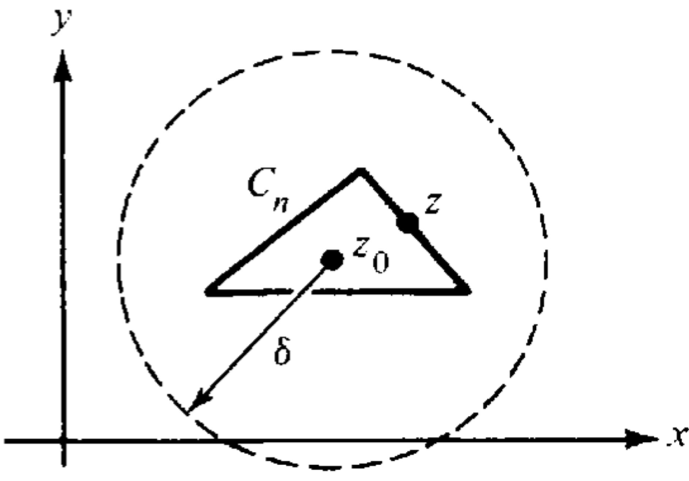 ∃N .s.t ∀n≥N⟹∣z−z0∣<21Ln<δ, ∀z∈Tn,Ln=∮Cn∣dz∣. 而且 Ln=21Ln−1=⋯=(21)nL。如此一來,